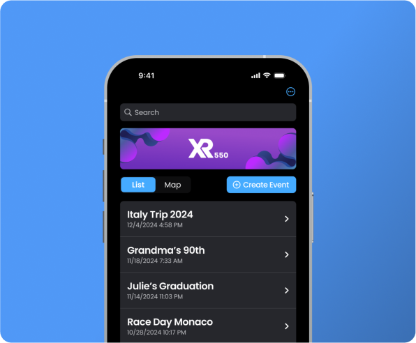 XR550 is your all-in-one app for capturing, organizing, and reliving your favorite moments directly from your iPhone. Whether you're on a quick family trip or documenting an epic adventure, XR550 helps you create "Events" for photos, videos, and other files, then tags each piece of media to a specific location on a map.